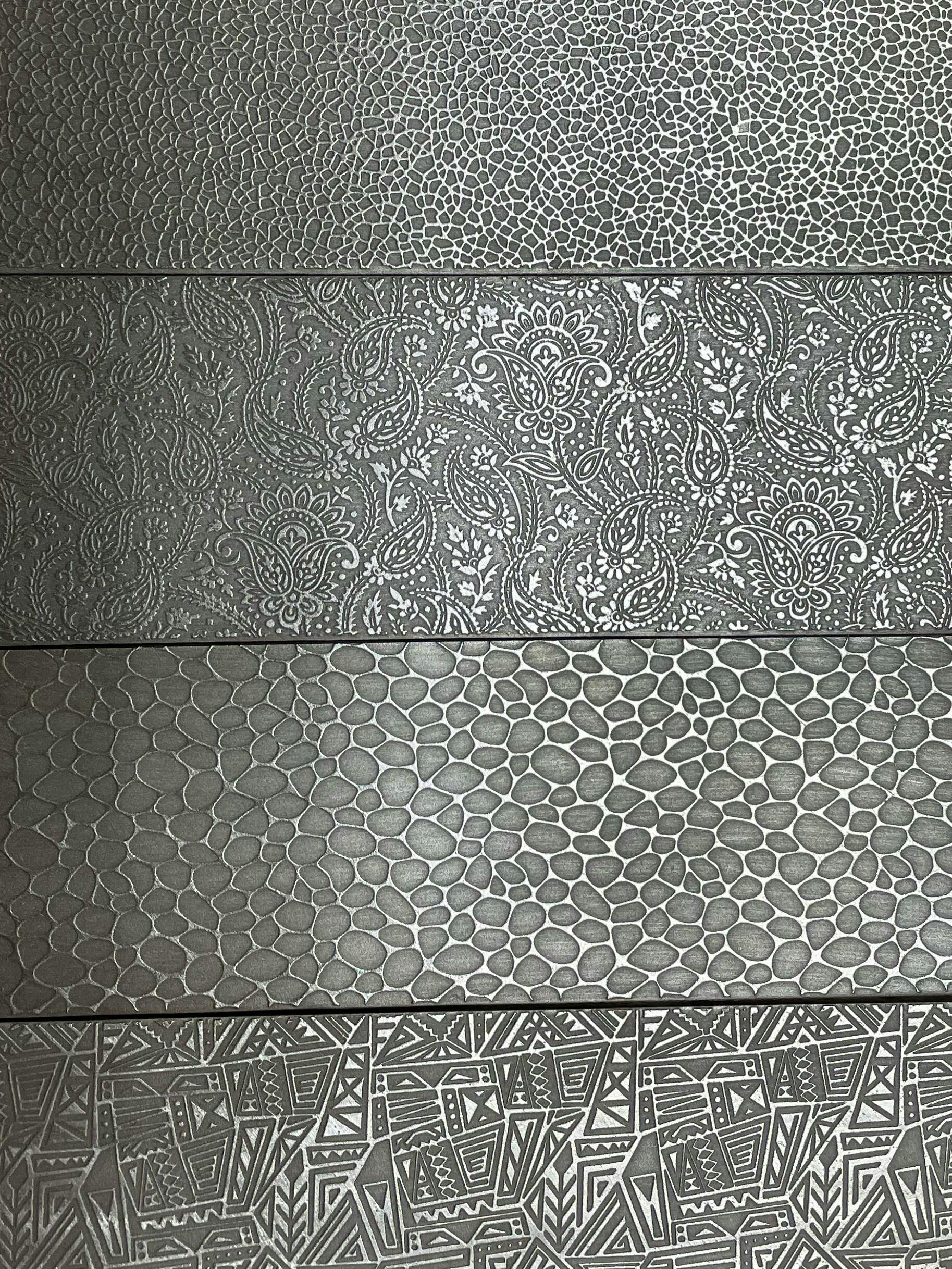 Introducing our meticulously hand-etched plates, expertly crafted from mild steel to elevate your metalworking projects. Each plate is available in a variety of sizes and boasts a sturdy 1/8" thickness. These versatile plates are designed for use with rolling mills, hydraulic presses, or manual techniques using a hammer and a firm medium (such as lead or a ball of aluminum foil). They are the perfect tool to effortlessly transfer intricate designs onto your annealed non-ferrous or precious metals.